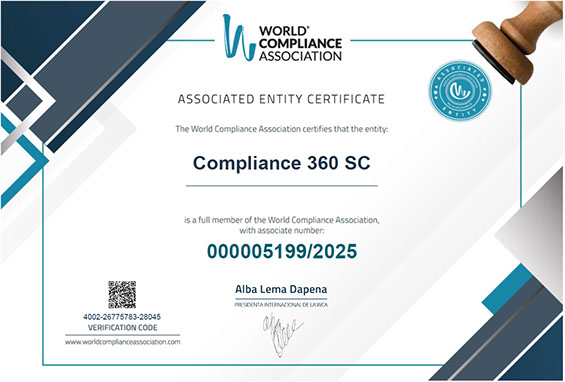 Como resultado de nuestro compromiso con los temas del Complimiento Normativo, nuestra firma lo refirma al formar parte de la WORLD COMPLIANCE ASSOCIATION (WCA), quien agrupa Profesionales y Organizaciones que tienen el objetivo, de la promoción, reconocimiento y evaluación de las actividades de cumplimiento en las organizaciones (con independencia de su forma jurídica), así como el desarrollo de herramientas y procesos para una correcta protección frente a determinados delitos/infracciones cometidas por sus empleados, colaboradores o cualquier otra persona relacionada con ella.